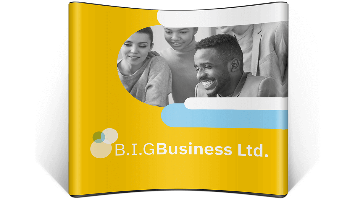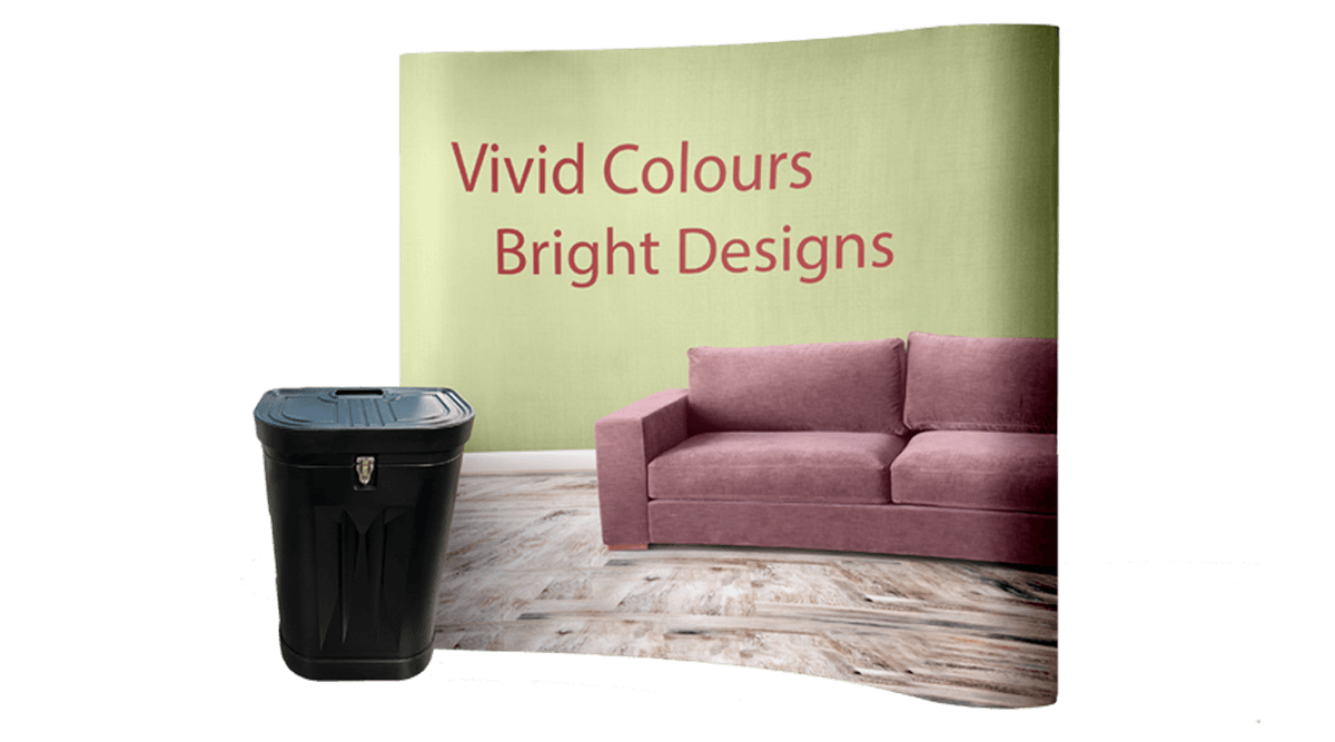 A premium curved pop-up stand with printed graphics, lights and plain carry case. 3 centre panels and 2 end panels.