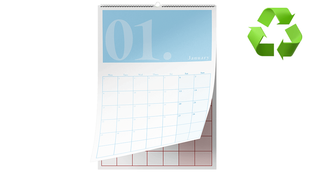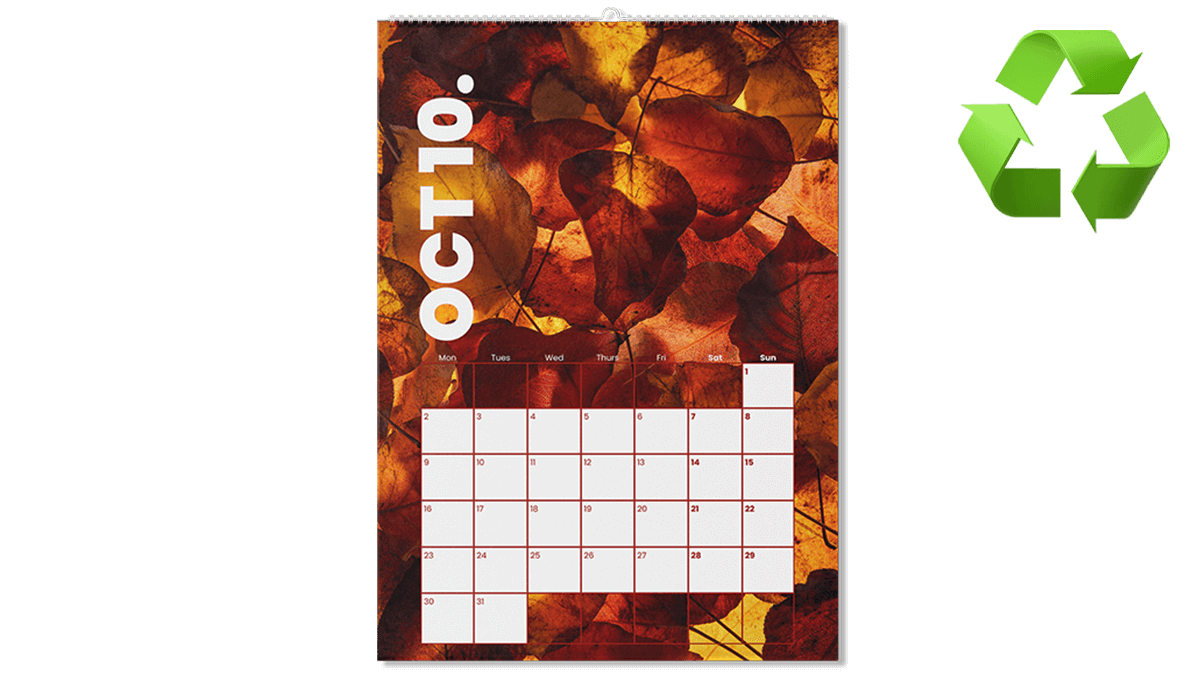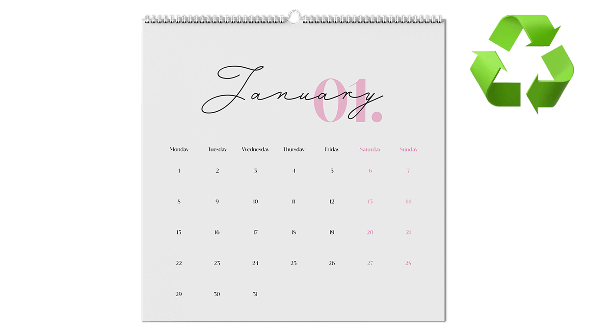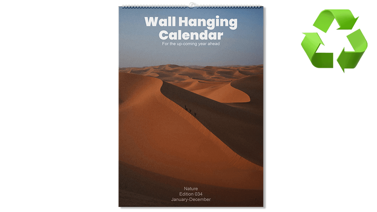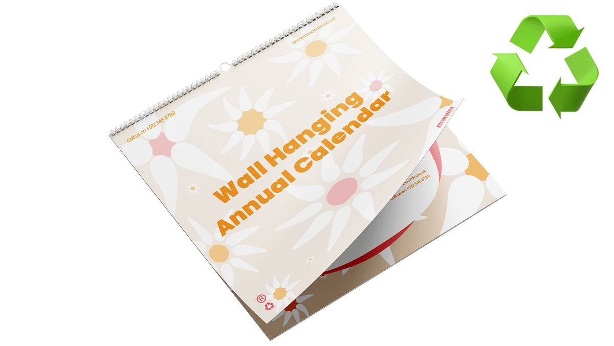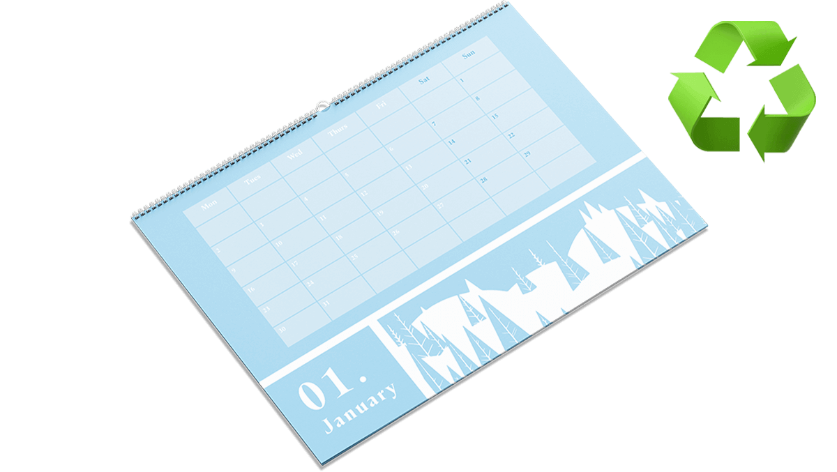 A wall hanging calendar that is available in 4 sizes. A5, A4, A3 and 210mm x 210mm. The calendar is wiro bound with white wire and thumb cut with a hanger for hanging on your wall. Our recycled uncoated paper has a soft tactile finish that is more absorbent than other papers making the ink appear flatter and can also be written on.