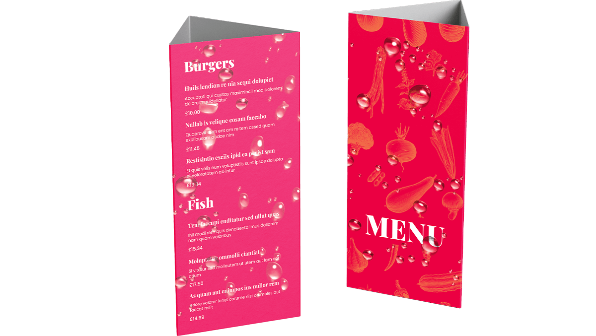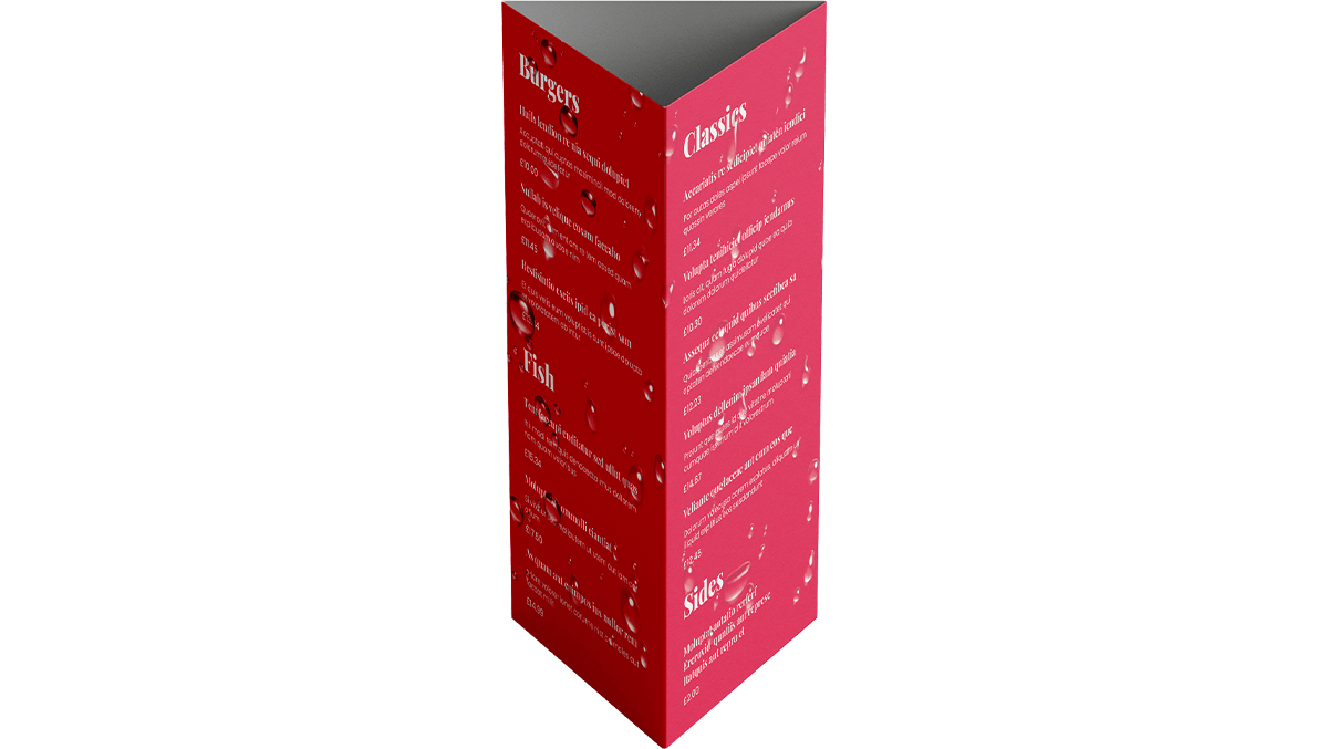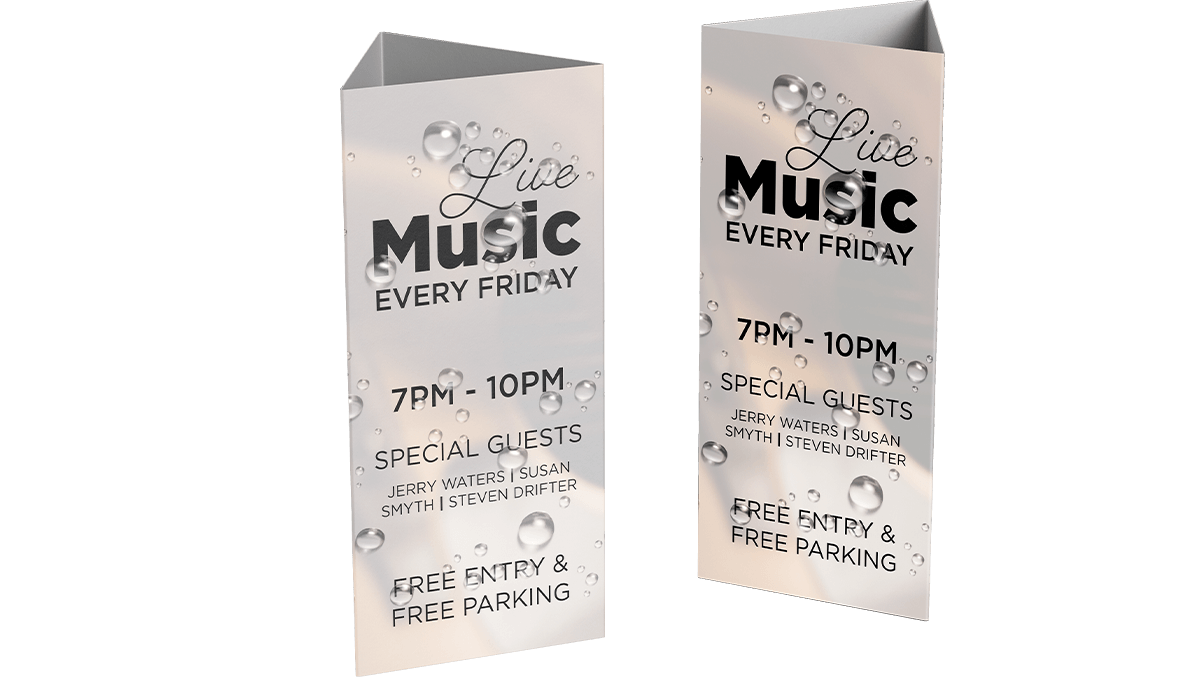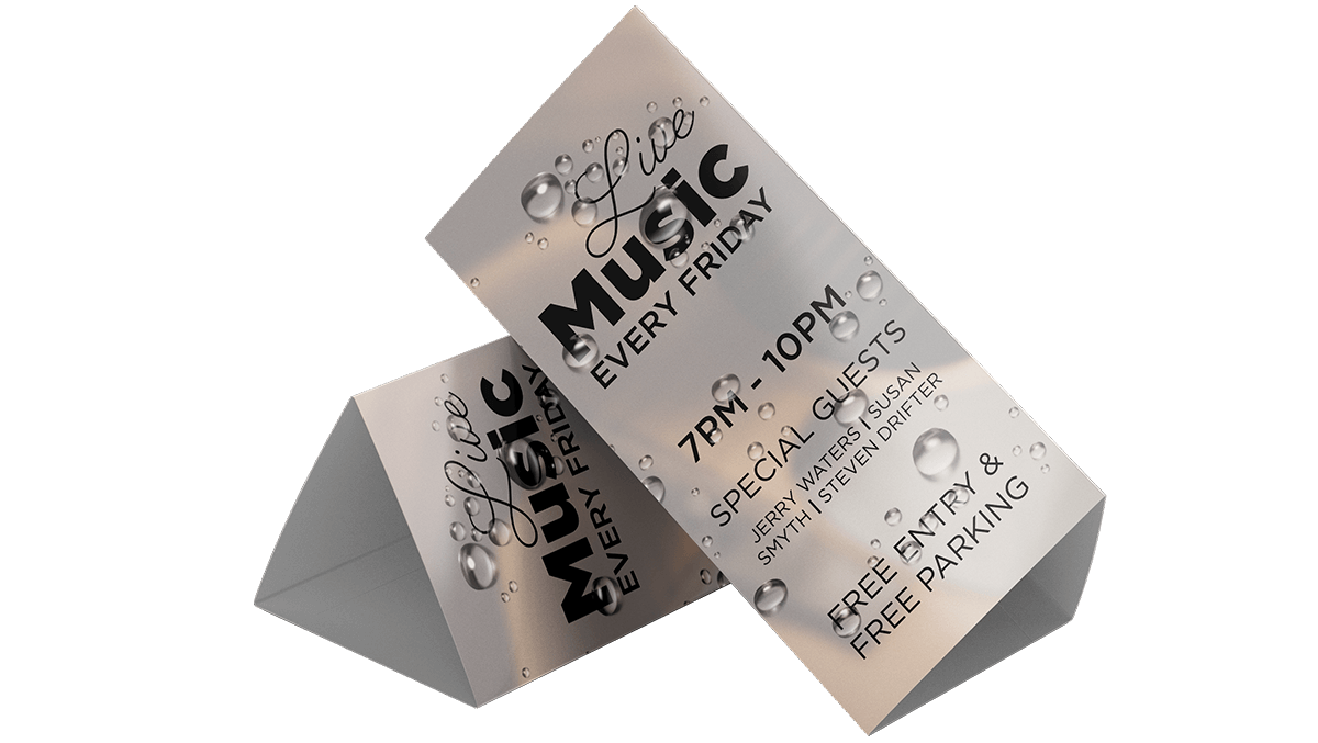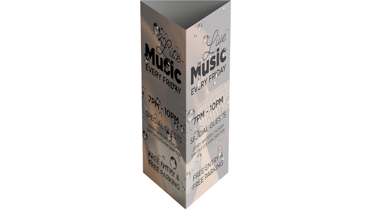 These triple-sided Table Talkers can be printed with or without lamination and remain waterproof as they are printed on Synaps. Synaps synthetic paper is waterproof, tear-proof and recyclable. It has a special coated surface with anti-static treatment that gives a smooth matt finish. Prints like paper! They are supplied flat, making them easy to store and can be assembled when needed.