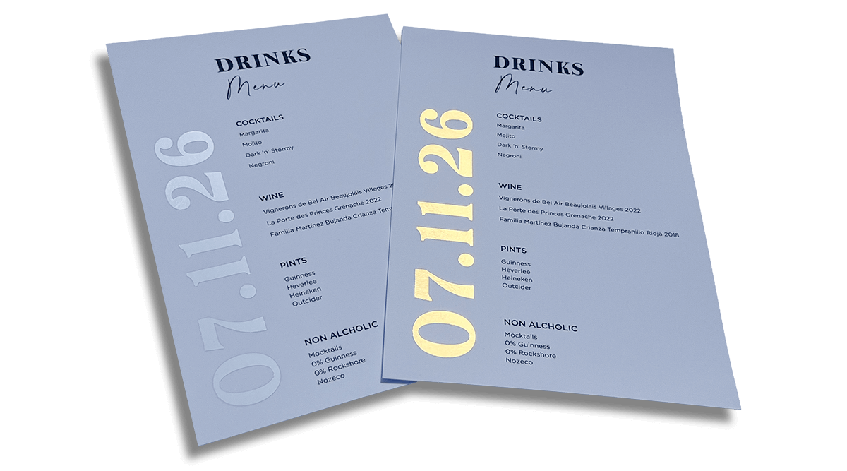 Supply Wedding Menus in time your customers’ big day by ordering online at TradeDigitalPrint.ie. We have unrivalled turnaround and delivery times to Dublin and beyond. Plus, our price match promise ensures that we won’t be beaten on price.