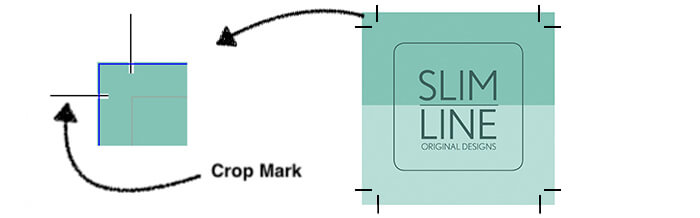 Crop marks, also known as trim marks, are lines printed from the corners of your sheet, or sheets, of paper to show us where to guillotine. When an image or color on the page extends past the crop marks on the sheet, it is regarded as bleed.