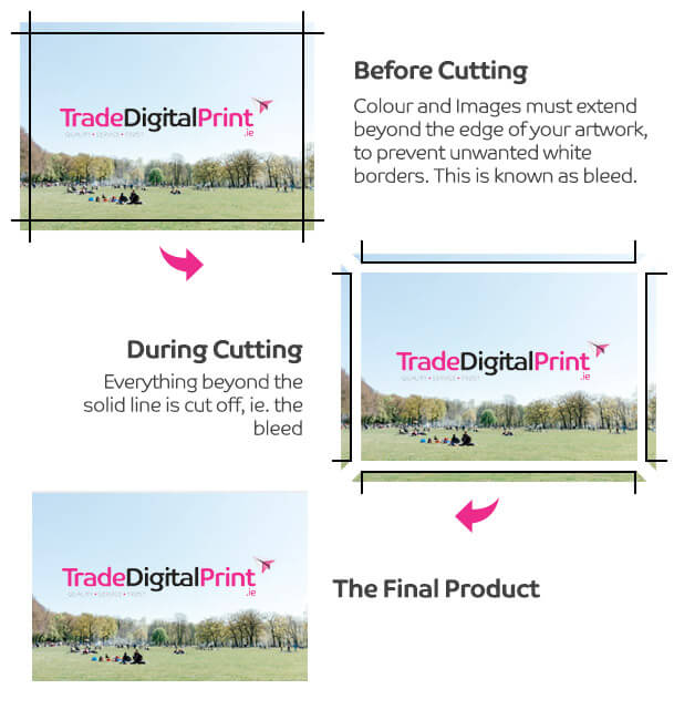 Bleed is the term used for ink that extends past the edge, or trim size - of the page. On any press, there will always be a small amount of movement when a job is printed. If your artwork is only the exact size of the page, you may see a fine white line at the very edge when the page is trimmed. To prevent this, you should always add 3mm bleed to your artwork; that is, make your artwork 3mm wider all round than the trim size of the page.